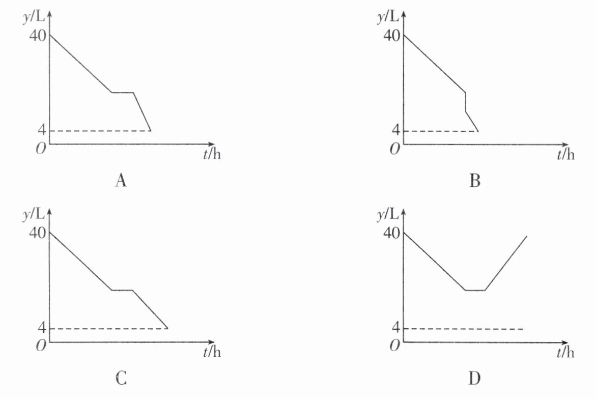 3. 某人驾车匀速从甲地前往乙地,中途停车休息了一段时间,出发时油箱中有40L油,到乙地后发现油箱中还剩4L油,则油箱中所剩油$y(L)与时间t(h)$之间函数图象可能是(