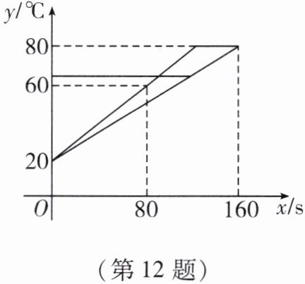 12. 李强用甲、乙两种具有恒温功能的热水壶同时加热相同质量的水,甲壶比乙壶加热速度快. 在一段时间内,水温$y(^{\circ }C)与加热时间x(s)$之间近似满足一次函数关系,根据记录的数据,画函数图象如下: