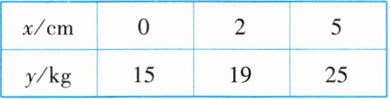 11. 物理实验证实:在弹性限度内,某弹簧长度$y(cm)与所挂物体质量x(kg)满足函数关系y= kx+15$. 下表是测量物体质量时,该弹簧长度与所挂物体质量的数量关系.