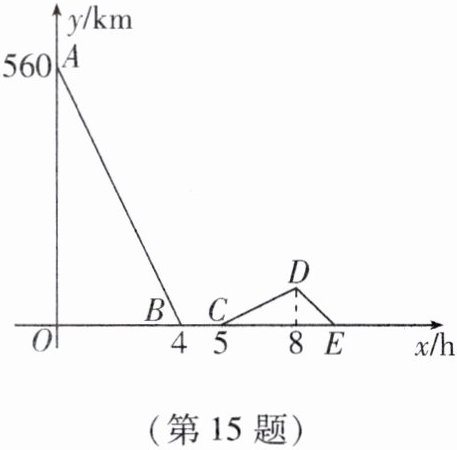 15. 一辆慢车与一辆快车分别从甲、乙两地同时出发,匀速相向而行,两车在途中相遇后停留一段时间,然后分别按原速一同驶往甲地后停车. 设慢车行驶的时间为$x$h,两车之间的距离为$y$km,图中折线表示$y与x$之前的函数图象,请根据图象解决下列问题: