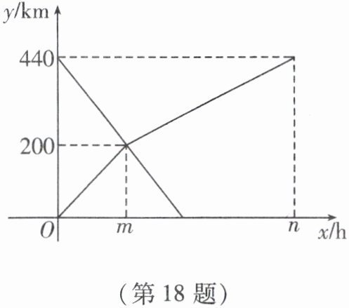 18. 已知$A$,$B两地之间有一条长440\ km$的高速公路. 甲、乙两车分别从$A$、$B$两地同时出发,沿此公路相向而行,甲车先以$100\ km/h的速度匀速行驶200\ km$后与乙车相遇,再以另一速度继续匀速行驶$4\ h到达B$地;乙车匀速行驶至$A$地,两车到达各自的目的地后停止. 两车距$A地的路程y(km)与各自的行驶时间x(h)$之间的函数关系如图所示.