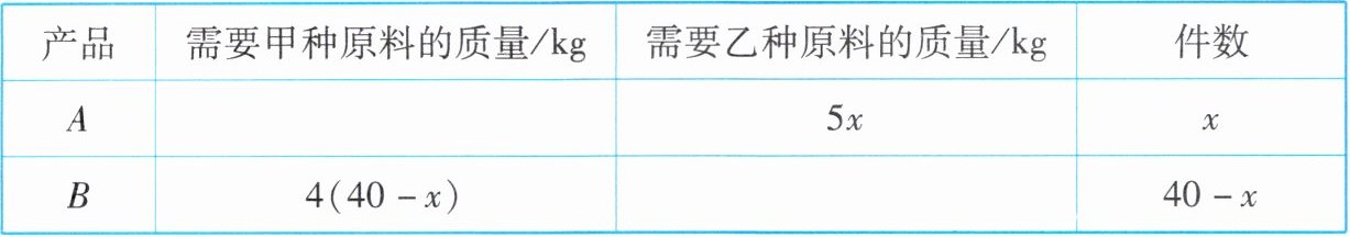 解:由题意,得$ \begin{cases} 8x + 4(40 - x) \leq 260, \\ 5x + 9(40 - x) \leq 270. \end{cases} $解得