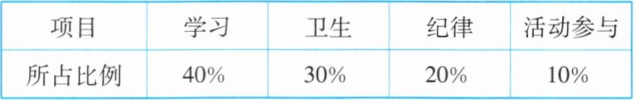 9. 某校评选先进班集体,从“学习”“卫生”“纪律”“活动参与”四个方面综合考核打分,各项满分均为100,所占比例如表所示.某班这四项得分依次为93,85,78,80,则该班四项综合得分为
