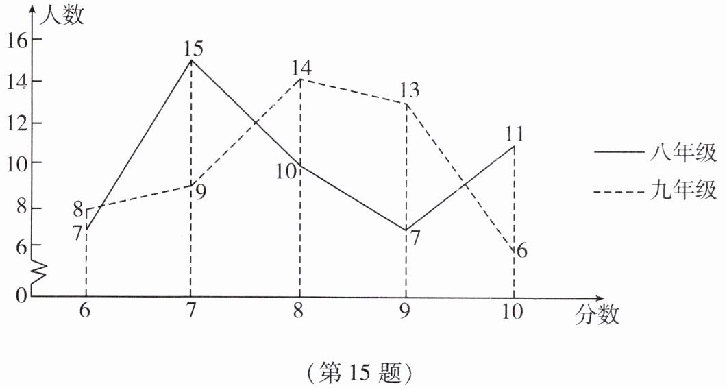 15. 学校团委在八、九年级各抽取50名团员开展团知识竞赛,为便于统计成绩,制定了取整数的计分方式,满分10分.竞赛成绩如图所示: