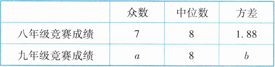 ②如果从众数角度看,八年级的众数为7分,九年级的众数为8分,所以应该给九年级颁奖;如果从方差角度看,八年级的方差为1.88,九年级的方差为1.56,又因为两个年级的平均数相同,九年级的成绩的波动小,所以应该给九年级颁奖;综上所述,应该给九年级颁奖.
