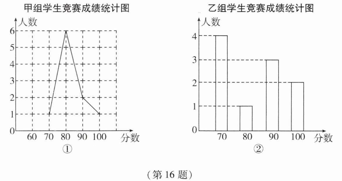 16. 某校在开展“网络安全知识教育周”期间,在八年级中随机抽取了20名学生分成甲、乙两组,每组各10人,进行“网络安全”现场知识竞赛.把甲、乙两组的成绩进行整理分析(满分100分,竞赛得分用x表示:90≤x≤100为网络安全意识非常强,80≤x<90为网络安全意识强,x<80为网络安全意识一般).收集整理的数据制成如下两幅统计图: