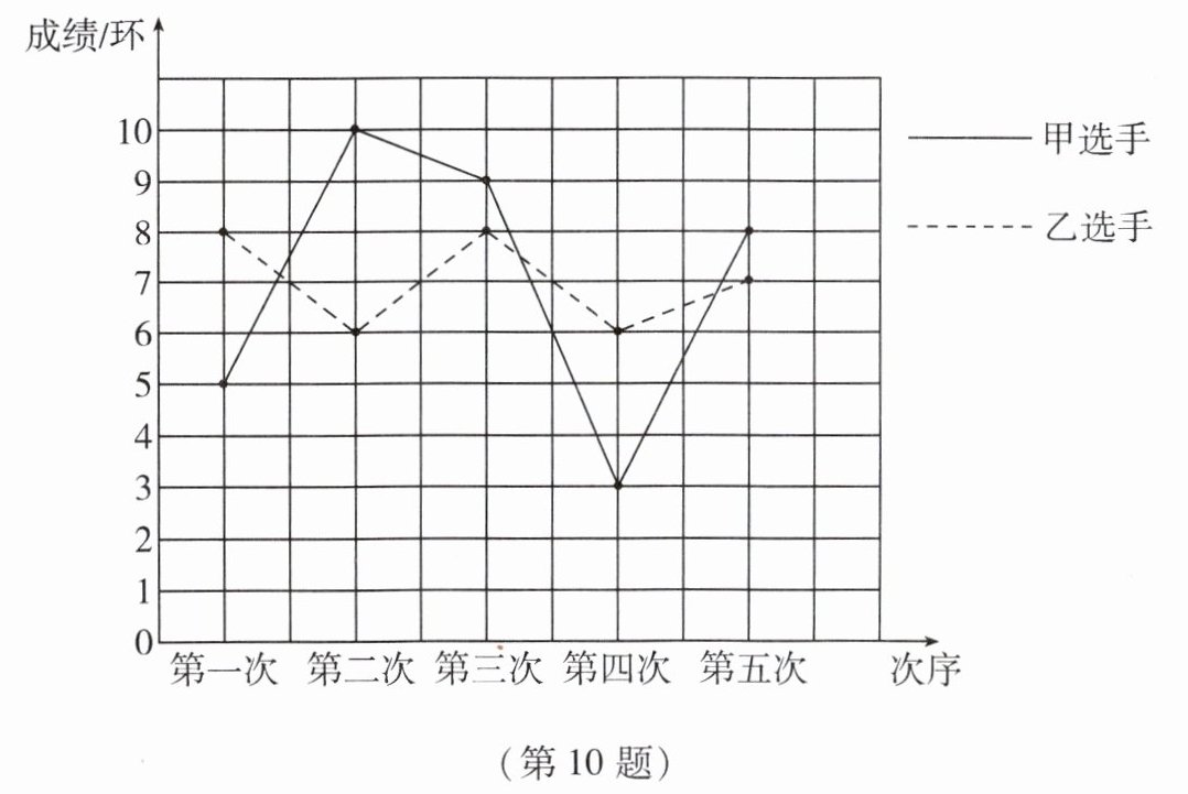 10. 某射击运动队进行了五次射击测试,甲、乙两名选手的测试成绩如图所示,甲、乙两选手成绩的方差分别记为$S_{甲}^{2}$,$S_{乙}^{2}$,则$S_{甲}^{2}$