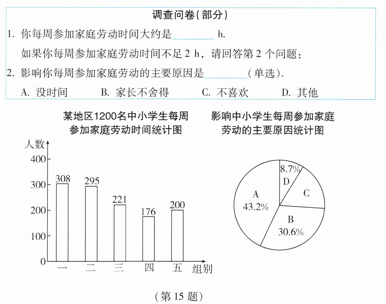 15. 某教育部门为了解本地区中小学生参加家庭劳动时间的情况,随机抽取该地区 1200 名中小学生进行问卷调查,并将调查问卷(部分)和结果描述如下: