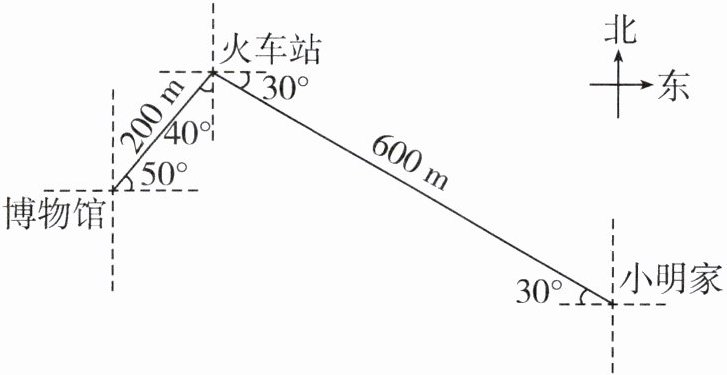 )°方向走200m到达博物馆。(2)小明每分走80m,从家出发先到火车站,再到博物馆,共需多少分?