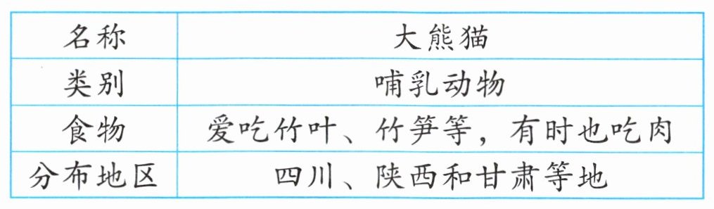 二、大熊猫人见人爱,是我们的国宝。许多小朋友想更多地了解大熊猫,可以参考下面图表中提供的信息,也可以再查找资料,介绍一下大熊猫。