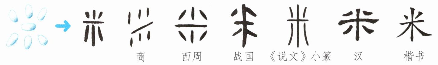 古文的“米”字,代表散落的米粒。“米”部的字一般与米和谷类食物有关。
