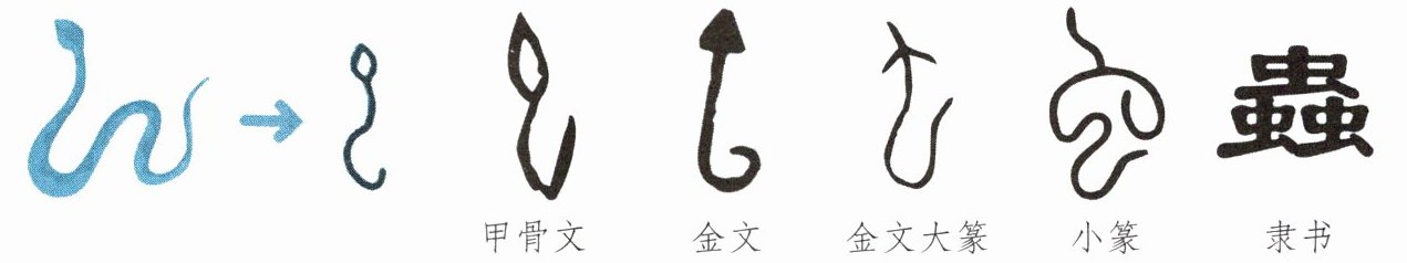古时的人用“虫”字来指一般动物,并非专指昆虫。“虫”的古字是一条蛇的外貌,后来人们把三个“虫”合成“蟲”字(“蟲”是“虫”的繁体字,读chóng),代表种类繁多的虫类。