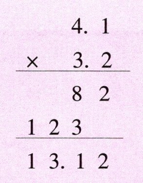 我们把4.1和3.2分别扩大到它们的10倍,积就扩大到了原来的100倍,计算41×32 = 1312,把1312再缩小到它的$\frac{1}{100}$就是4.1和3.2的积了,所以4.1×3.2 = 13.12。