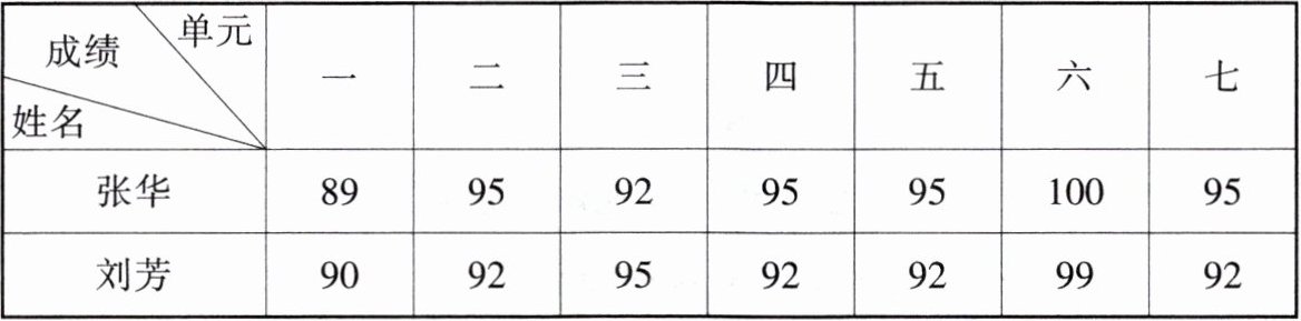 - 然后,根据张华的成绩$(89,95,92,95,95,100,95)$和刘芳的成绩$(90,92,95,92,92,99,92)$,在坐标图中依次描点。