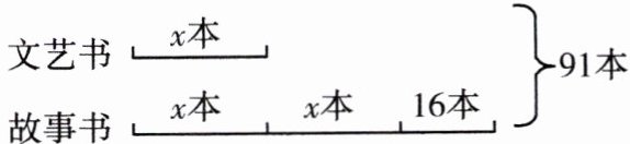已知文艺书有$x$本,故事书有$(2x + 16)$本,两种书一共有$91$本,可列方程: