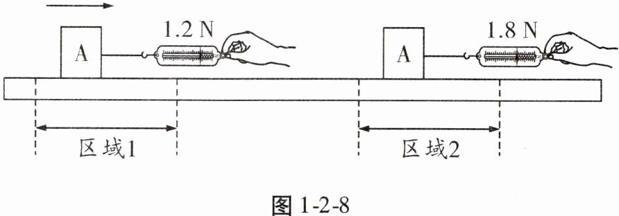 4. 如图1-2-8所示,小明在测量滑动摩擦力时,将物块A置于水平木板上,用弹簧测力计水平向右拉物块A,使其始终做匀速直线运动。经过区域1和区域2时,弹簧测力计的示数分别为1.2 N和1.8 N。两区域示数不同的原因是(