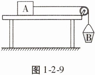 5. 如图1-2-9所示,物体A放在粗糙程度相同的水平桌面上,用平行于桌面的细线通过定滑轮与小桶B相连。逐渐向小桶B中加入细沙,当小桶和细沙的总质量为m时,物体A恰好沿水平桌面匀速向右运动(忽略绳重和滑轮摩擦)。下列判断正确的是(