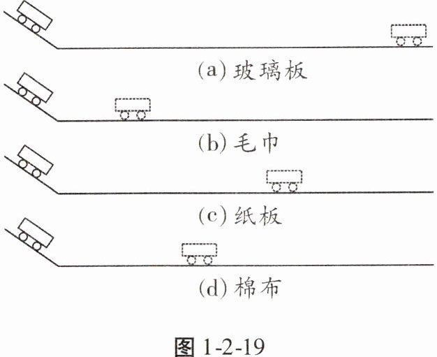 (7)如图1-2-19所示的实验装置中,四种接触面的粗糙程度由小到大的顺序是玻璃板、纸板、棉布、毛巾。为了便于推理得出结论,请将图中的四次实验排出合理的顺序:______