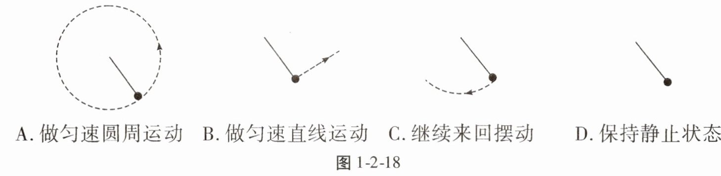 (6)做完实验后,小明思考如下问题:荡秋千运动到最高点时,如果自己受到的力全部消失,自己将会处于怎样的运动状态呢?你认为图1-2-18中正确的是______