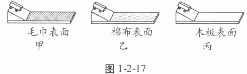 12. 如图1-2-17所示,在学习牛顿第一定律时,同学们分组进行了“探究阻力对物体运动的影响”的实验。