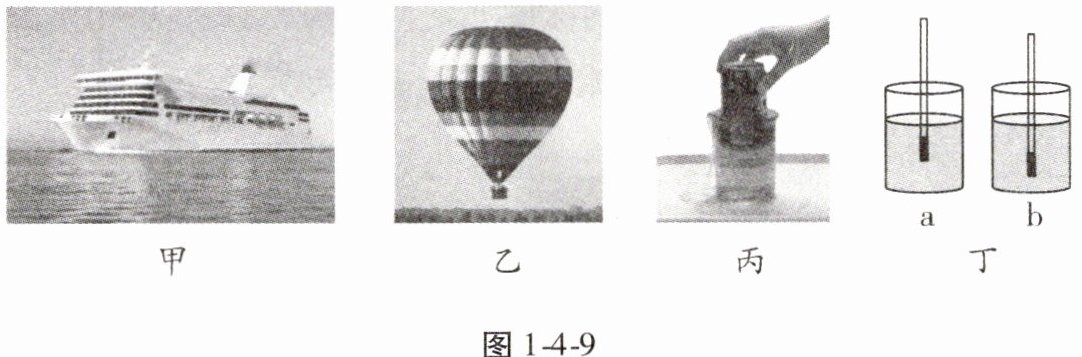 D. 图丁中,同一密度计在两种液体中所受浮力$F_{a}=F_{b}$,两种液体的密度$\rho_{a}>\rho_{b}$