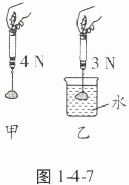 3. 如图1-4-7所示,将小石块挂在弹簧测力计下,再将其浸没在水中(小石块没有碰到烧杯底部),静止时弹簧测力计的示数分别是4N和3N。下列说法错误的是(