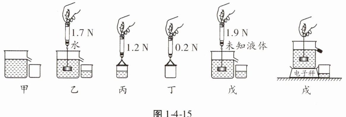 $kg/m^{3}$。在图1-4-15戊中,若圆柱体触到了溢水杯杯底,则会导致该液体密度的测量值偏______大