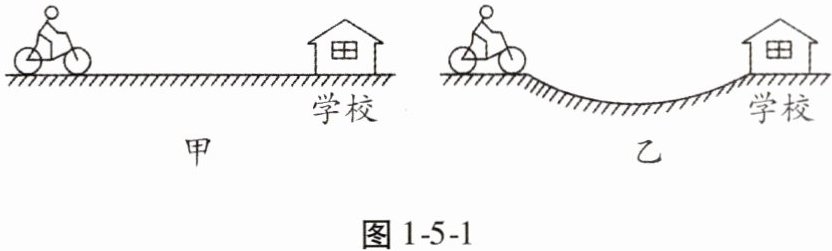 如图1-5-1甲是小林从家到学校的一条水平公路,爱动脑筋的他做了这样的设想:将从家到学校的路挖成一个“U”形,如图1-5-1乙所示,只要从家骑上自行车,不用刹车也不用蹬脚踏板,等车停下来就可以到达学校了。