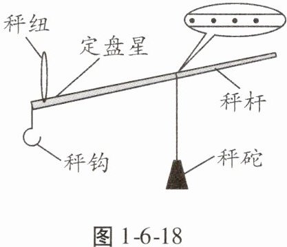 3. (2024·通辽中考)小明家有一把杆秤(如图1-6-18所示),秤钩上不挂物体时提住秤纽,将秤砣移动至定盘星处时,秤杆恰能水平平衡。当秤钩挂上物体移动秤砣使秤杆再次水平平衡时,即可通过秤砣所对应的刻度读出物体的质量。下列说法正确的是(