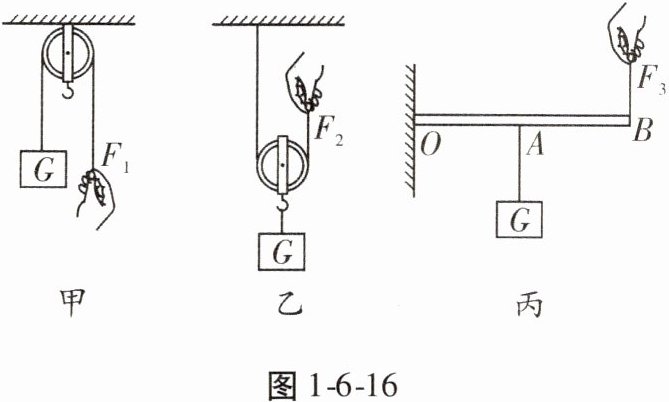 1. (2024·东营中考)如图1-6-16所示,用甲、乙、丙三种简单机械分别提起同一重物G。已知滑轮重20 N,杠杆(OB = 2OA)重10 N,手的拉力始终沿竖直方向,忽略绳重及摩擦。下列说法错误的是(