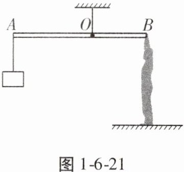 6. (2024·青海中考)如图1-6-21所示是小宁同学利用健身器材进行锻炼的示意图,其中横杆AB可绕固定点O在竖直平面内转动,OA长1 m,OB长0.6 m,在横杆的A端用绳子悬挂质量为15 kg的配重,小宁在B端施加竖直向下的拉力F₁时,横杆AB在水平位置平衡。已知小宁重为450 N,两只脚与地面接触的总面积为0.04 m²,不计横杆重与绳重,g取10 N/kg。