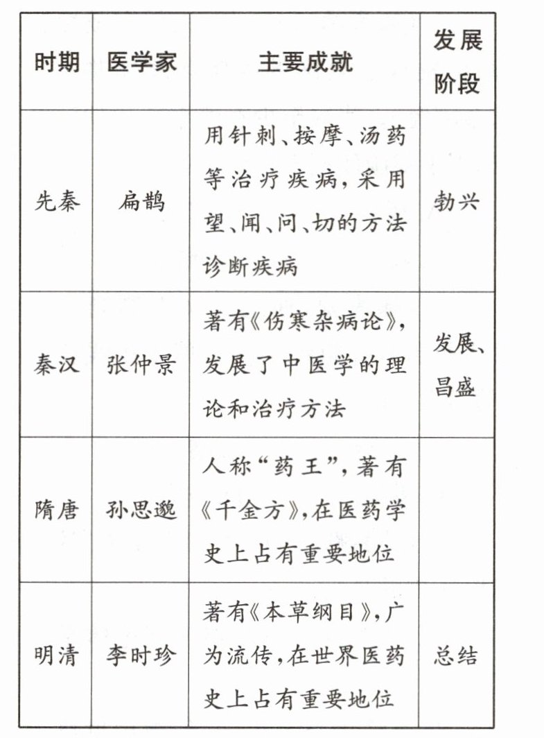 材料 传说神农氏尝百草,开中医发展之先河。甲骨文记载的疾病有数十种,西周时开始分科治病,此后中医学的发展概况见下表。