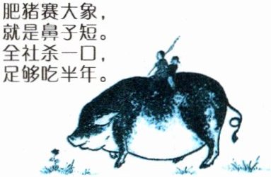 这是“大跃进”时期的一幅宣传画。宣传画左上角的诗是:肥猪赛大象,就是鼻子短。全社杀一口,足够吃半年。