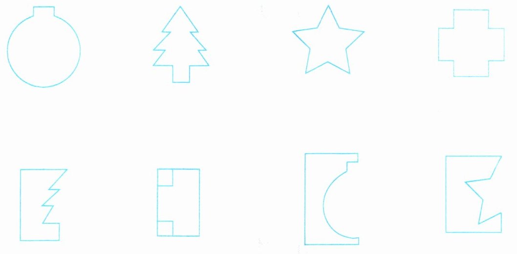 【解析】:通过观察图形的形状特征进行连线。第一行第一个圆形图案,与第二行第二个内部有两个小矩形缺口(类似从圆形纸张剪去部分后可能出现的特征,可想象为圆形纸张剪去两个小矩形部分)的图形相连;第一行第二个圣诞树形状图案,与第二行第四个有类似圣诞树轮廓缺口(下方较宽上方有分叉形状缺口)的图形相连;第一行第三个五角星图案,与第二行第一个有五角星形状缺口的图形相连;第一行第四个十字形图案,与第二行第三个有十字形缺口(可看作是在方形纸张上剪出十字形)的图形相连。