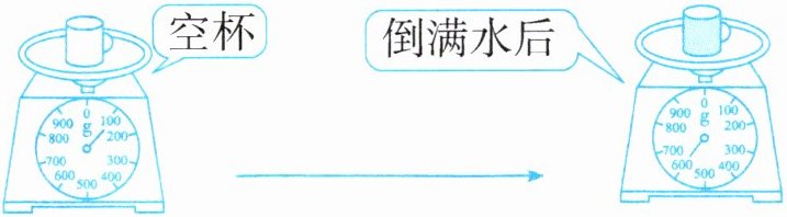 【解析】:观察天平可知,空杯重$100$克,倒满水后重$600$克,那么水的重量就是倒满水后杯子和水的总重量减去空杯的重量,即$600 - 100 = 500$(克)。