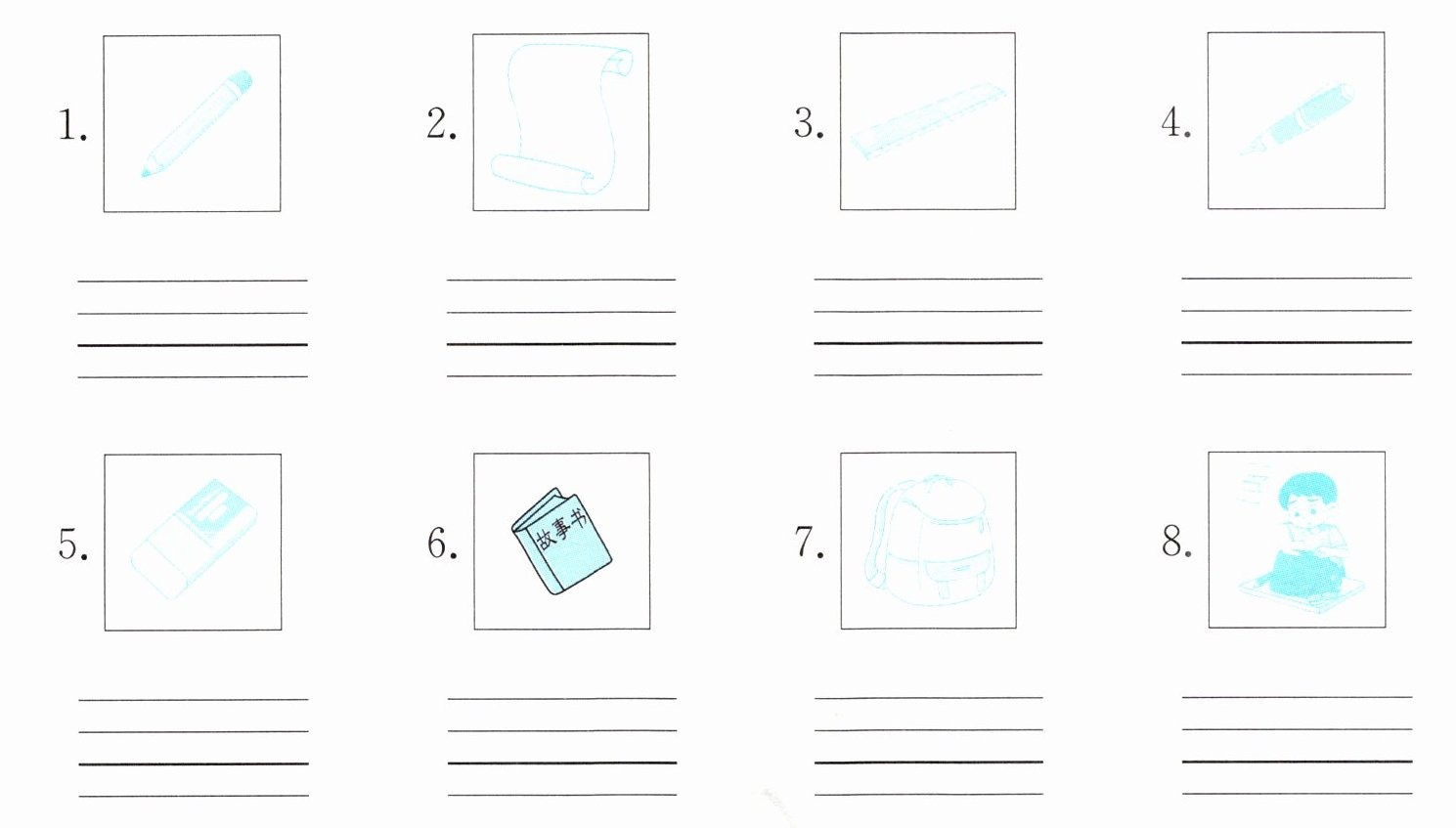 1. pencil 2. paper 3. ruler 4. pen 5. eraser 6. book 7. bag 8. find