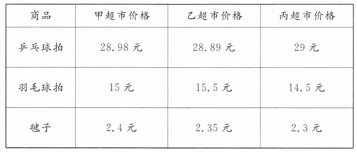 小龙要买乒乓球拍、羽毛球拍和毽子。下面是三家超市的价格,为了节约开支,请给小龙提出合理的建议。