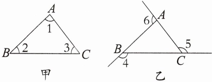 1. (浙江省嘉兴市期末)如图甲,$∠1$、$∠2$、$∠3$是三角形$ABC$的三个内角。现将三角形的三条边$AB$、$BC$、$CA$分别延长,形成了$∠4$、$∠5$、$∠6$三个角,这三个角叫三角形的外角,如图乙。不测量,你能推理得出$∠4$、$∠5$和$∠6$这三个外角的和是多少度吗?请写出你的思考过程。
