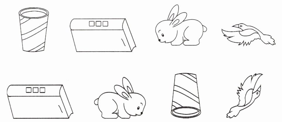 圈第一个杯子和倒数第二个杯子;圈第二个长方体和倒数第三个长方体;圈第三个兔子和倒数第二个兔子;圈第四个鸟和倒数第一个鸟。