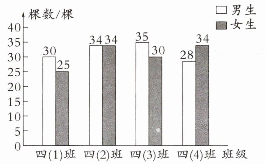 7. 某校四年级 4 个班男生、女生植树情况如下图。