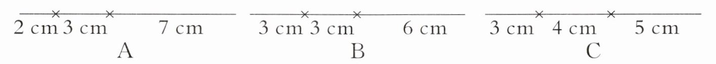 4. 把一根铁丝剪成三段,围成一个三角形,下面剪法中能围成三角形的是( )。