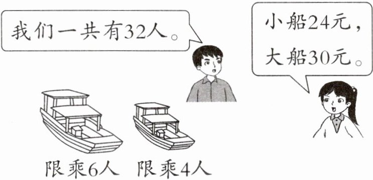 $24÷4 = 6$(元/人) $30÷6 = 5$(元/人) 所以尽可能租大船,而且不能有空座。 $32÷6 = 5$(条)……2(人) 租 5 条大船,其余 2 人租 1 条小船 $5×30 + 1×24 = 174$(元) 租用 4 条大船和 2 条小船:$6×4 + 4×2 = 32$(人) 满座 $30×4 + 24×2 = 168$(元) 168 元 < 174 元 租用 4 条大船和 2 条小船最省钱。