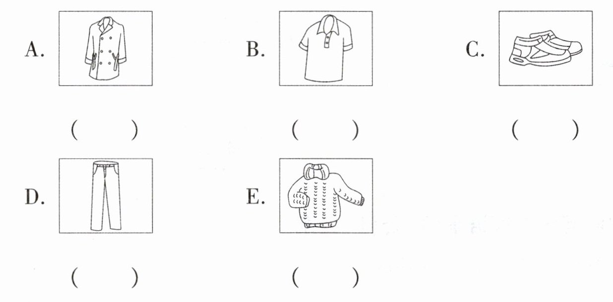 1. ACDE 2. A 白色;C 蓝色;D 蓝色;E 红色 3. 示例:hat,gloves,socks 等(画图略)