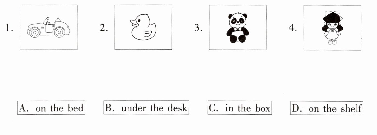 Good morning! My name is Lily. I have many toys in my room. Look! This is a big toy car. It's under the desk(书桌). I have a toy duck. It's white. It's very cute. It's on the shelf. This is my toy panda. It's from my aunt. It is on my bed. I have a new doll. Where is it? Look! It's in the nice box. I like my room and my toys!