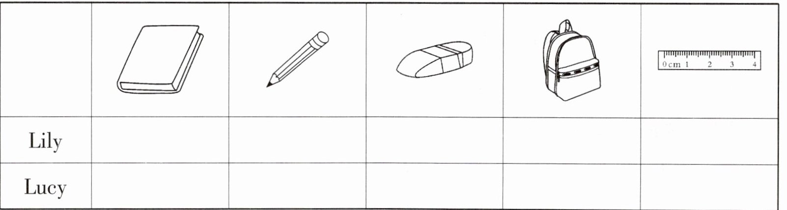 Hello! I'm Lily. I'm twelve years old. I have a younger sister. Her name is Lucy. She is eleven years old. We have many books. I have fifteen books. My sister has twelve books. I like pencils. I have nineteen pencils. Lucy only has ten pencils. I also have some erasers. I have thirteen erasers. Lucy has sixteen erasers. I don't have many bags. I only have two bags. Lucy has seven bags. I have seventeen rulers. Lucy has fourteen rulers.