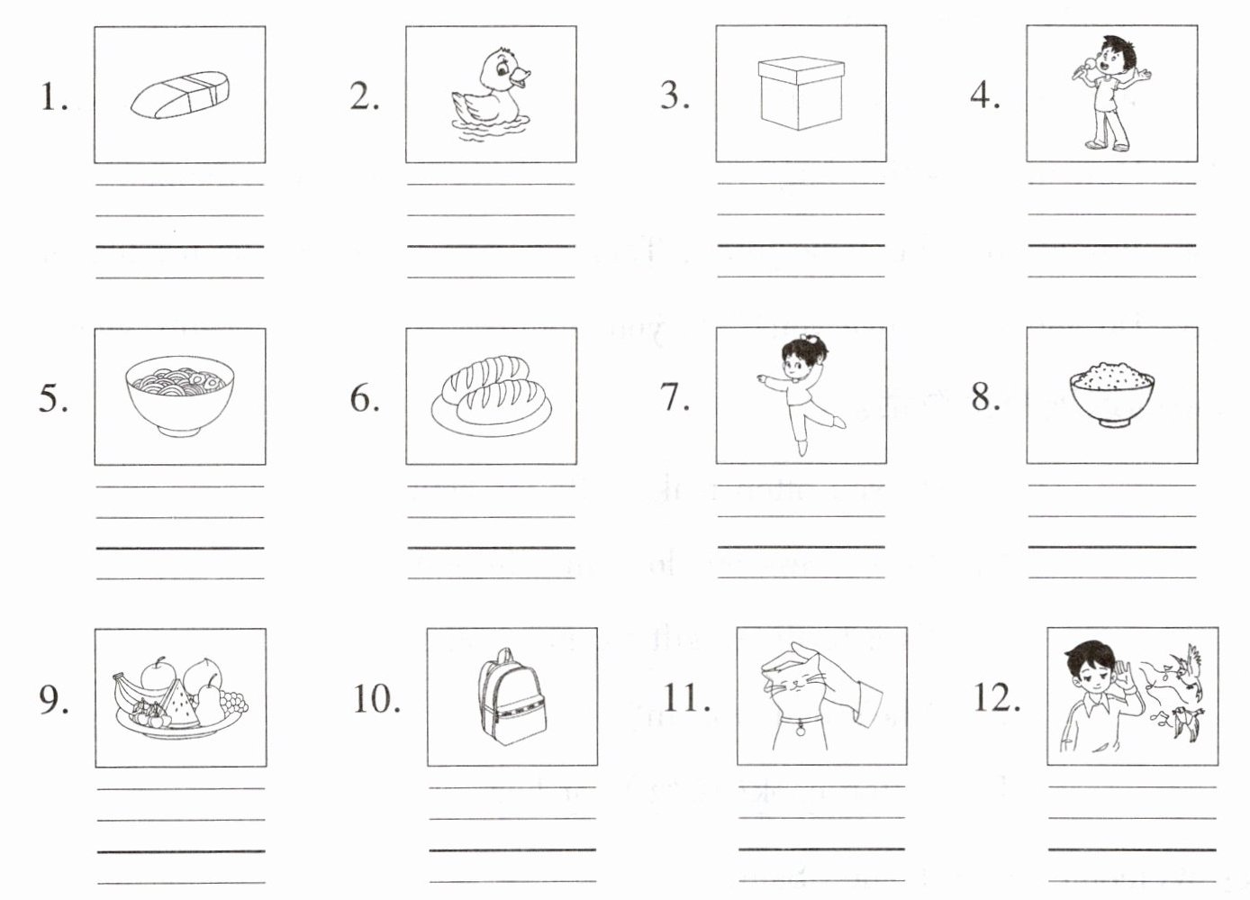 1. eraser 2. duck 3. box 4. sing 5. noodles 6. bread 7. dance 8. rice 9. fruit 10. bag 11. touch 12. hear