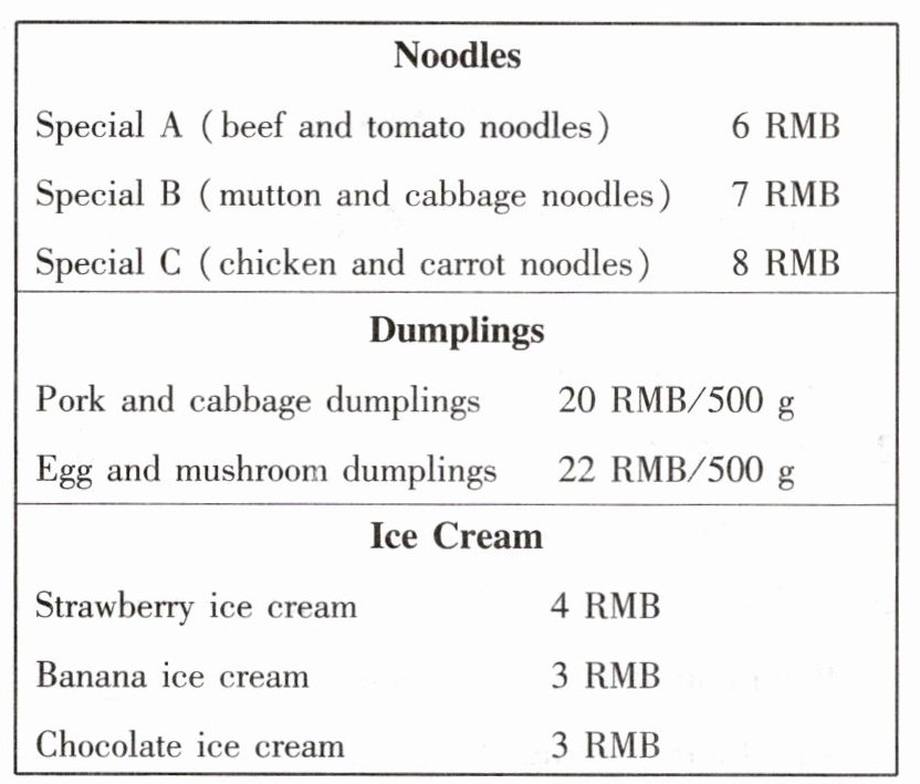 4. If you have 250 g of egg and mushroom dumplings for lunch, you should pay ____.