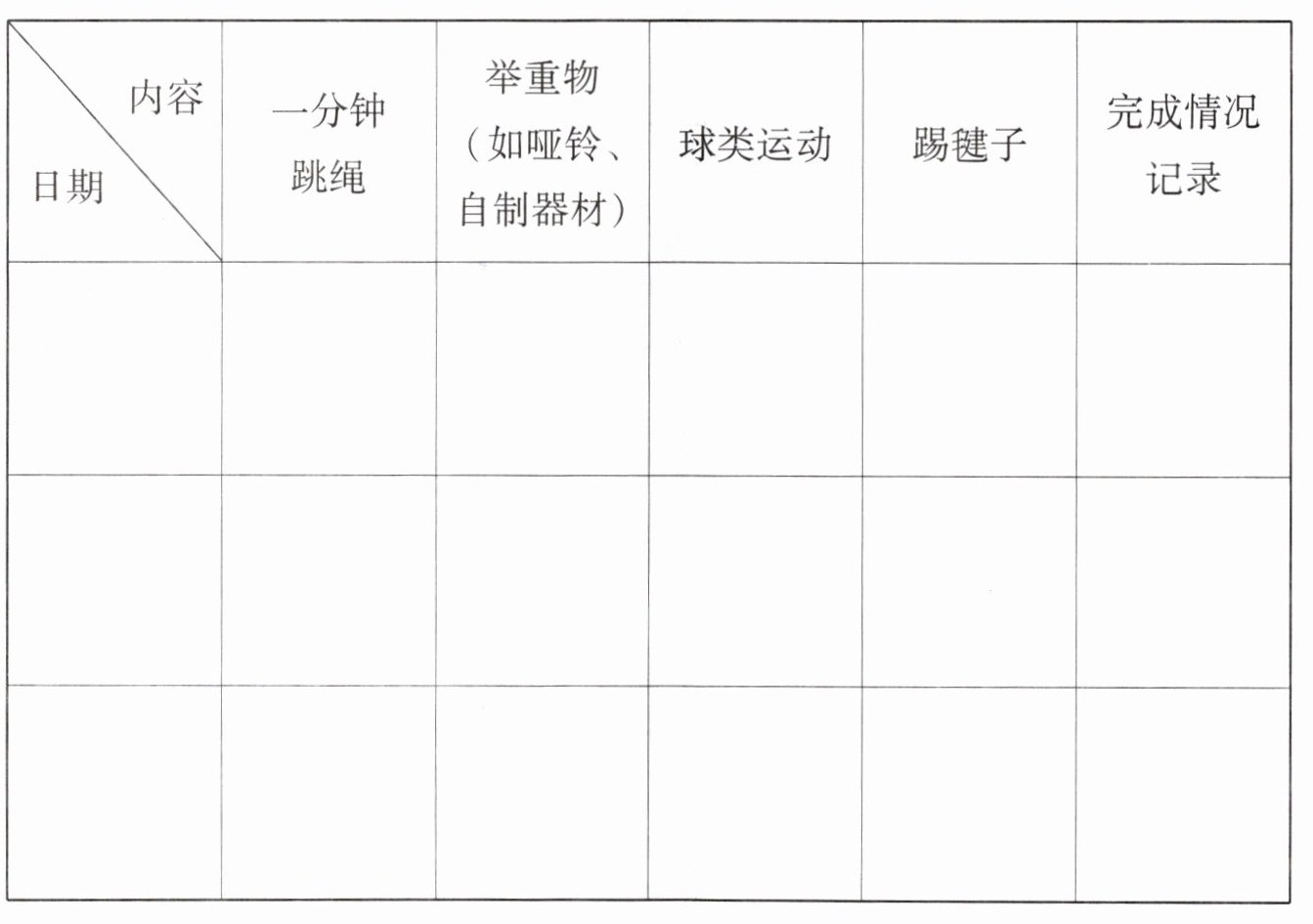 好的开始是成功的一半,制订计划有助于我们度过一个愉快且有意义的假期。制订计划的时候,我们可以把在假期里想做的几类主题活动列出来,如安排一个星期的外出旅行,看完几本有意义的课外书籍,做适量的体育锻炼等。我们可以把假期计划以表格的形式呈现(如下表)。