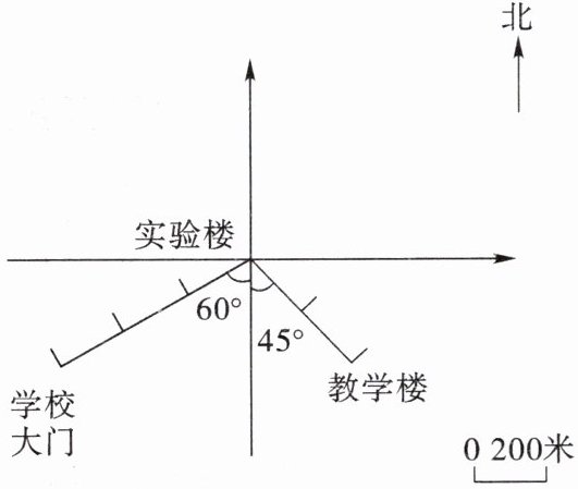 3. 解:因为图上$1$厘米代表实际距离$200$米,$600÷200 = 3$(厘米),所以以实验楼为观测点,在北偏东$40^{\circ}$方向画$3$厘米长的线段表示体育馆的位置。