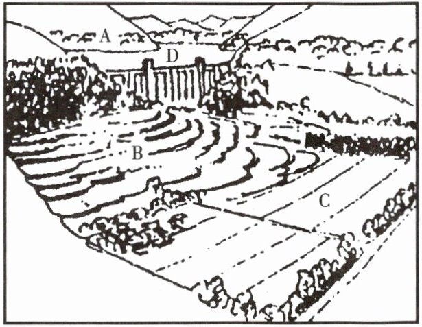 (1)B处—发展渔业;C处—种植小麦;D处—种植苹果;